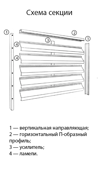 В необходимых случаях в конструкцию добавляется усилитель. Он дополнительно связывает ламели с горизонтальным профилем и не позволяет им провисать.