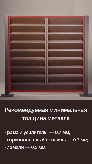 Толщина стали, из которых изготовлены направляющие и ламели, влияет как на прочность и  долговечность, так и на внешний вид забора. Также эта характеристика отражается на стоимости забора, так как, чем толще сталь, тем она дороже.