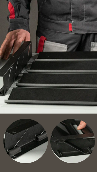 Для того чтобы возведение забора было быстрым и простым, а ограждение выглядело красиво и эстетично, мы разработали направляющие с прорезями. Благодаря тому, что прорези повторяют форму ламели, ошибиться при сборке невозможно.
