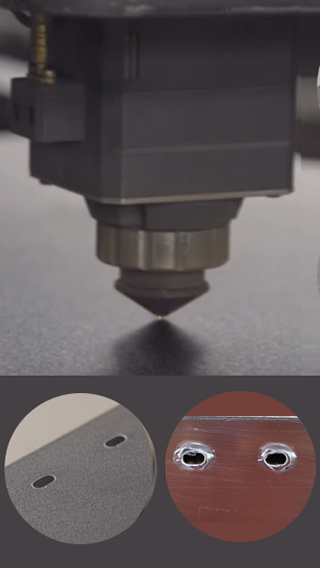 Луч лазера нагревает металл до температуры плавления, а струя сжатого газа удаляет расплавленную сталь из зоны реза. Из-за такой температуры полиэстер в зоне отверстия сгорает.