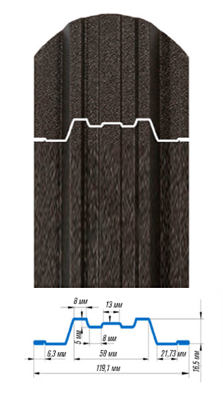 В конструкции забора используется планка П-образной формы шириной 120 миллиметров. В ней предусмотрено 14 ребер жесткости.