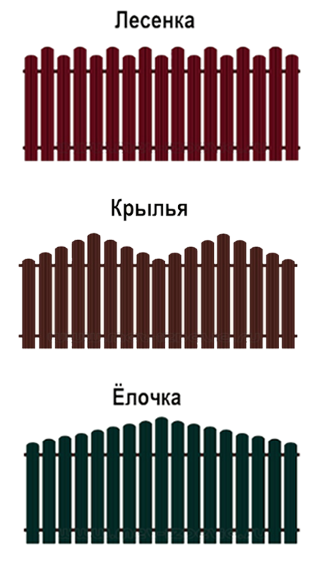 Также в конструкции можно комбинировать штакетник разной высоты и тогда верхний край забора будет фигурным. Так можно создавать различные варианты дизайна: пирамида, горка, лесенка, волна, крылья, елочка и прочие.