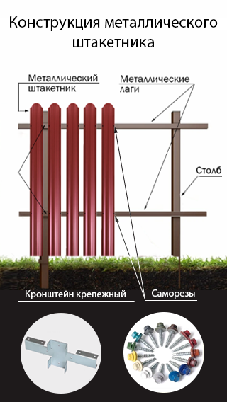 В любом варианте забора при монтаже, планки надежно фиксируются к лагам при помощи кровельных саморезов в цвет забора.