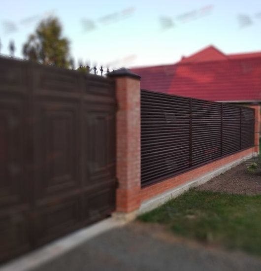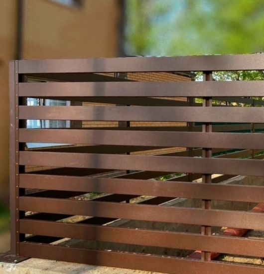Комби» сочетает в себе прямоугольную форму ламелей и их диагональное расположение по аналогии с заборами-жалюзи. За счет профиля в форме доски получается строгий, угловатый и массивный дизайн с эффектом объемности.