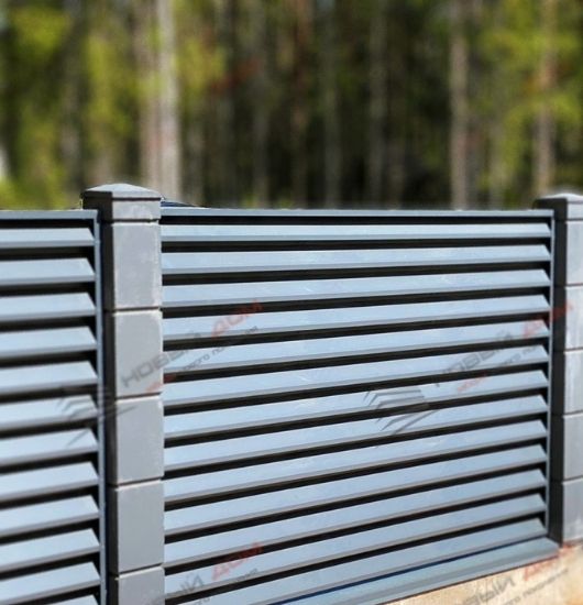 Премиум» и «Люкс» изготовлены в виде жалюзи и комплектуются ламелями в форме английской буквы «Z». С улицы забор визуально кажется глухим, что скрывает участок от посторонних глаз, а зона обзора изнутри, наоборот, позволяет свободно наблюдать за происходящим на улице. Комплектация «Модерн» отличается ламелями, изготовленными в форме домика, что обеспечивает презентабельный вид забора не только по фасаду участка, но и со стороны двора.