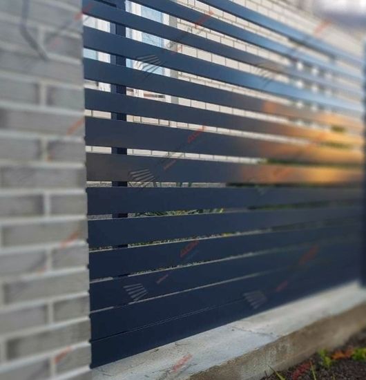 Рамы наших заборов наполняются стальными ламелями (кроме модели «Хай-тек» ), которые крепятся к двум вертикальным П-образным профилям. Сами профили монтируются к стальным или каменным столбам, установленным на прочном основании. Для придания жесткости конструкции горизонтальные ламели укрепляются поперечной планкой, которая исключает их провисание.